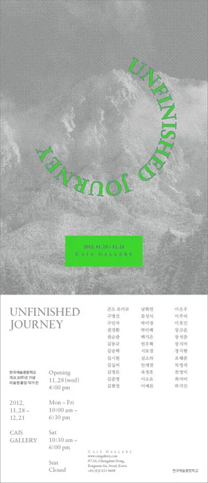 『미완의 여정(Unfinished Journey)』 展은 새로운 미술 교육법과 미술에 관한 뜨거운 대화와 변화의 자리를 마련해온 한국예술종합학교 미술원이 처음으로 졸업 작가들을 한 자리에 초대한 전시이다. 이 자리에서 우리는 같고도 다른 젊은 작가들의 작업을 바라보며 이들 각자의 예술 세계가 얼마나 다르고 하나로 합쳐질 수 없는가를 오히려 확인할 수 있었다. 이것은 '작가'라는 존재가 오늘날 각기 다른 자신만의 방식으로 예술세계를 창작해나가는 과정의 여로 속에 있음을 이야기한다.